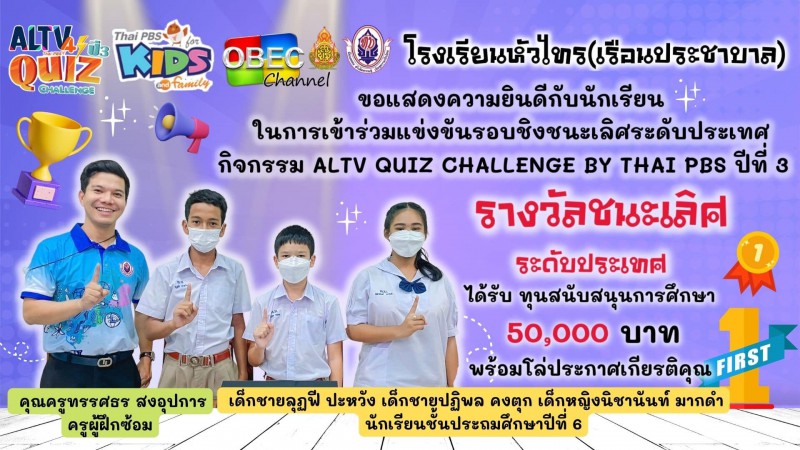 รางวัลชนะเลิศ ระดับประเทศ กิจกรรม ALTV Quiz Challenge by Thai PBS ปีที่ 3