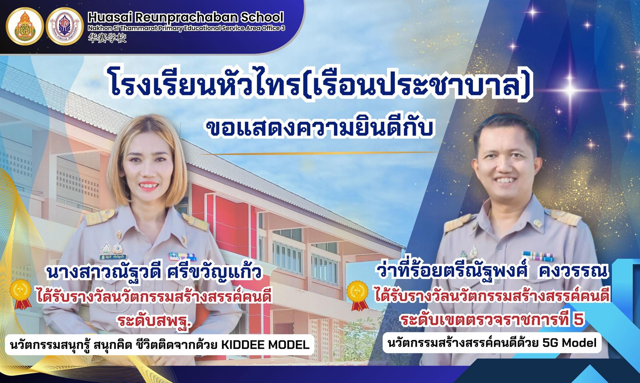 โรงเรียนหัวไทร (เรือนประชาบาล) ขอแสดงความยินดีกับผู้ที่ได้รับรางวัล "นวัตกรรมสร้างสรรค์คนดีระดับ สพฐ. " และรางวัล "นวัตกรรมสร้างสรรค์คนดีระดับเขตตรวจราชการที่ 5" นางสาวณัฐวดี ครีขวัญแก้ว และว่าที่ร้อยตรีณัฐพงศ์ คงวรรณ