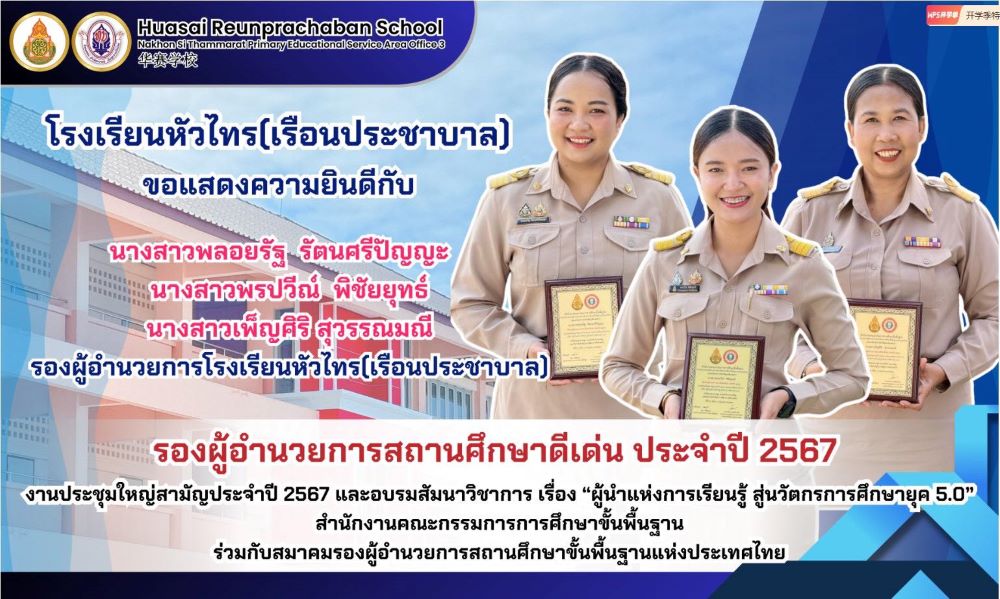 ขอแสดงความยินดี “รองผู้อำนวยการสถานศึกษาดีเด่น ประจำปี 2567” นางสาวพลอยรัฐ รัตนศรีปัญญะ , นางสาวพรปวีณ์ พิชัยยุทธ์ , นางสาวเพ็ญศิริ สุวรรณมณี ในงานประชุมใหญ่สามัญประจำปี 2567 และอบรมสัมมนาวิชาการ เรื่อง “ผู้นำแห่งการเรียนรู้ สู่นวัตกรรมการศึกษายุค 5.0