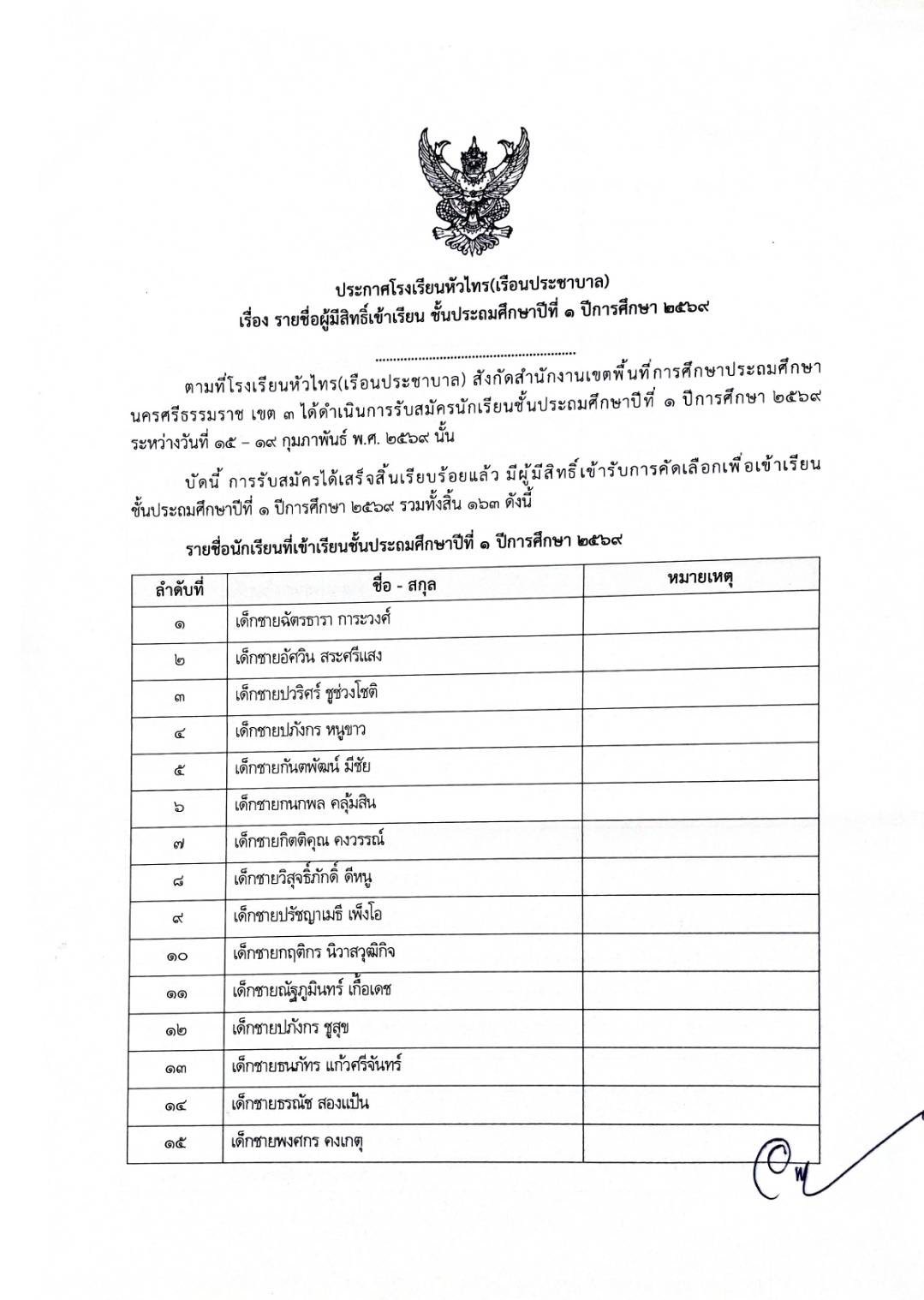 ตามที่โรงเรียนได้ดำเนินการรับสมัครนักเรียน ระหว่างวันที่ 15-19 กุมภาพันธ์ พ.ศ. 2569 บัดนี้การรับสมัครได้เสร็จสิ้นเรียบร้อยแล้ว และมีผู้มีสิทธิ์เข้ารับการคัดเลือกตามรายชื่อที่ปรากฏในประกาศ