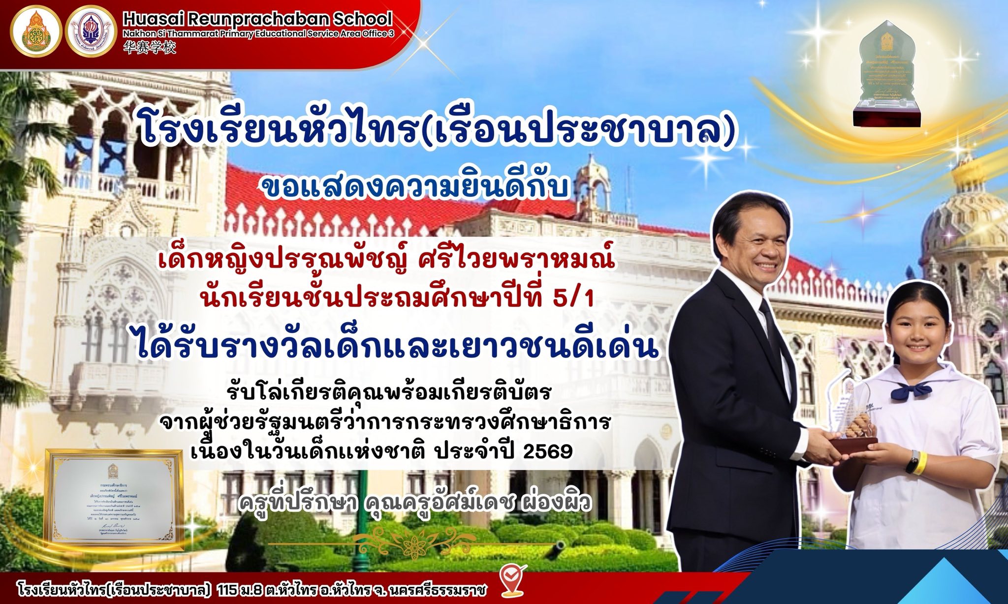 ดร. อาภรณ์ อ่อนคง ผู้อำนวยการโรงเรียนหัวไทร(เรือนประชาบาล) พร้อมด้วยคณะรองผู้อำนวยการ ครู บุคลากรทางการศึกษา และนักศึกษาฝึกประสบการณ์วิชาชีพ เข้าร่วมกิจกรรมวันเด็กแห่งชาติ ประจำปี 2569 จัดขึ้นโดยเทศบาลตำบลหัวไทร