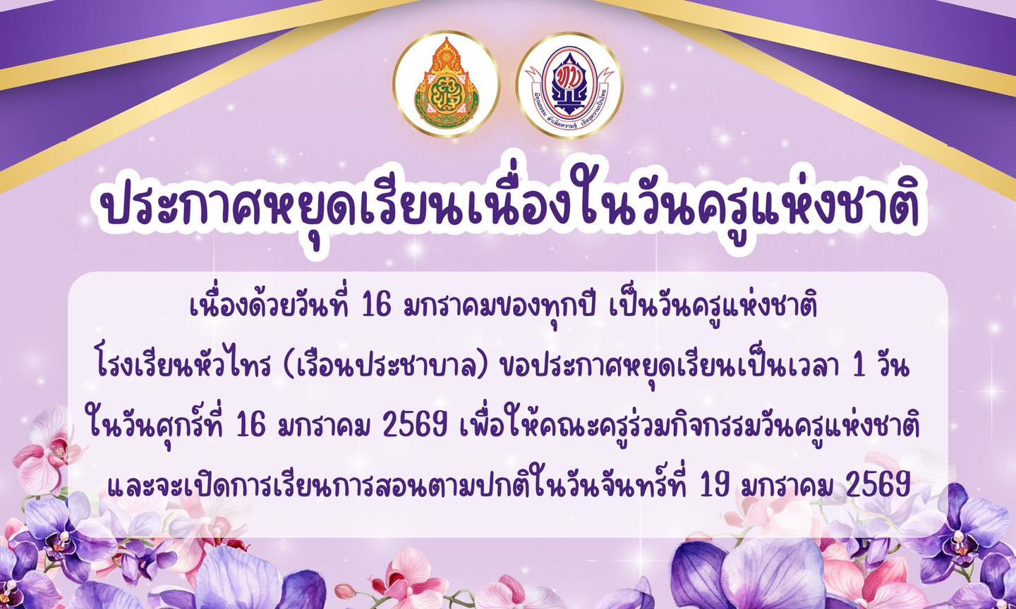 ยินดีต้อนรับเข้าสู่เว็บไซต์โรงเรียนหัวไทร(เรือนประชาบาล) ศุภฤกษ์ขึ้นปีใหม่ให้มีโชค ขจัดโศกวิโยคภัยใจมุ่งหมาย มวลสิริพิพัฒน์สุขสบาย เกษมสายสวัสดิ์ชื่นรื่นกมล ขออำนาจคุณพระไตรรัตน์เอื้อ บันดาลเกื้อสรรพชัยในทุกหน จงสัมฤทธิ์ธนสิทธิ์สว่างล้น ประจักษ์ดลโชติช่วงสถาพร
