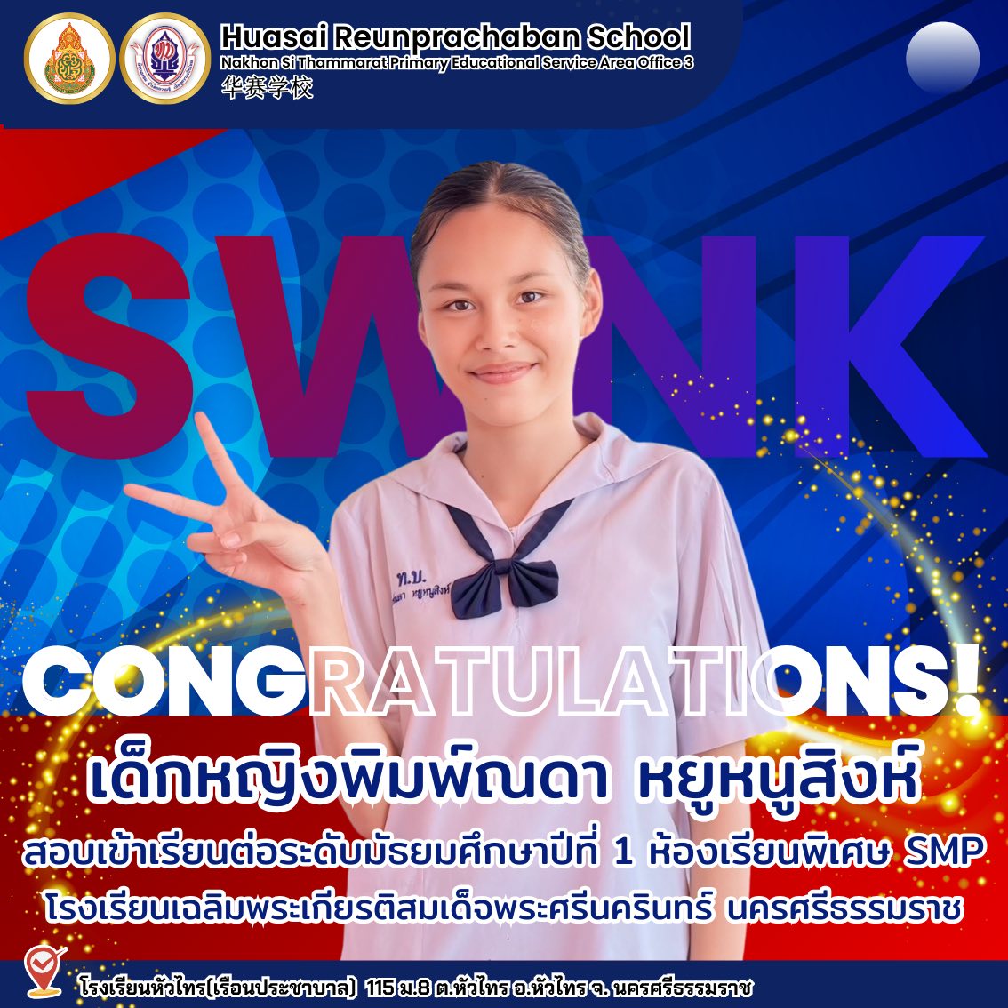 ขอแสดงความยินดีกับนักเรียนสอบได้เข้าศึกษาต่อระดับชั้นมัธยมศึกษาปีที่ 1 ห้องเรียนพิเศษวิทยาศาสตร์ คณิตศาสตร์ (SMP) โรงเรียนเฉลิมพระเกียรติสมเด็จพระศรีนครินทร์ นครศรีธรรมราช ในพระราชูปถัมภ์สมเด็จพระเทพรัตนราชสุดาฯ สยามบรมราชกุมารี