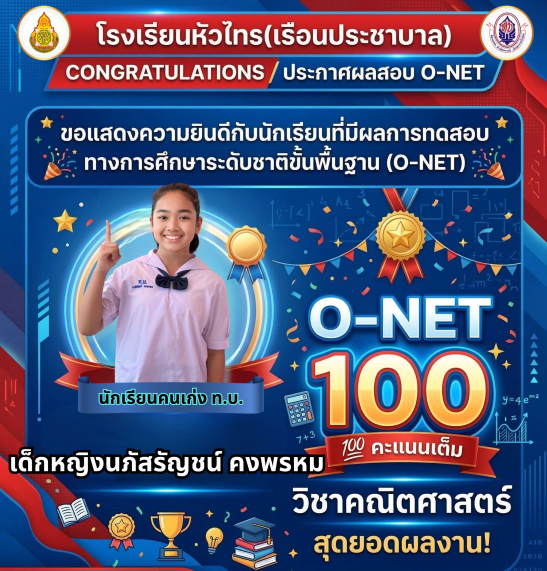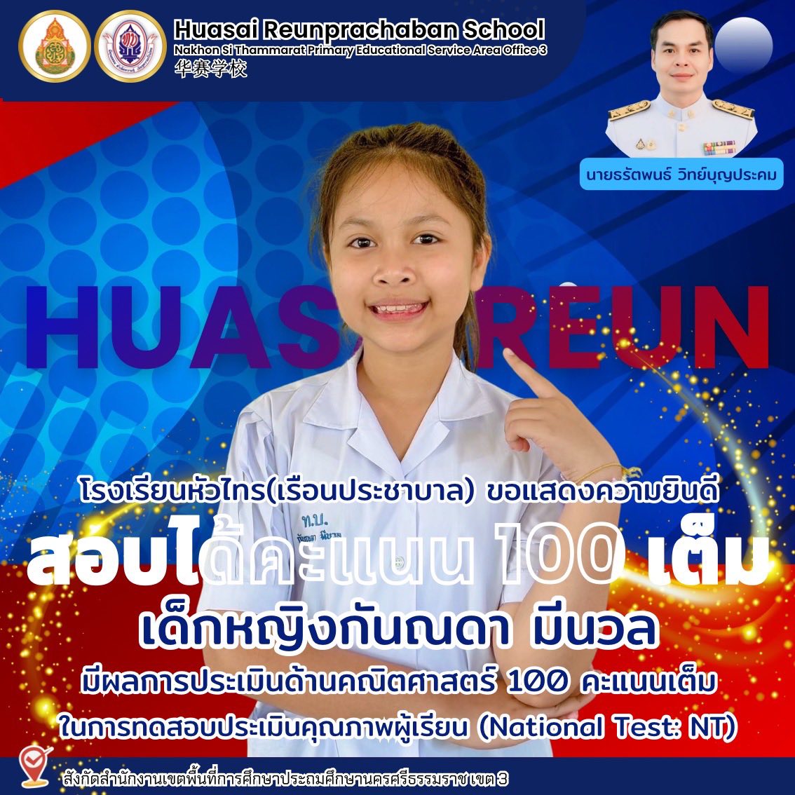 ขอแสดงความยินดีกับคณะครูและนักเรียน ที่มีผลการทดสอบประเมินคุณภาพผู้เรียน (National Test : NT) มีนักเรียนที่มีผลการประเมินด้านคณิตศาสตร์ 100 คะแนนเต็ม จำนวน 1 คน ได้แก่ เด็กหญิงกันณดา มีนวล