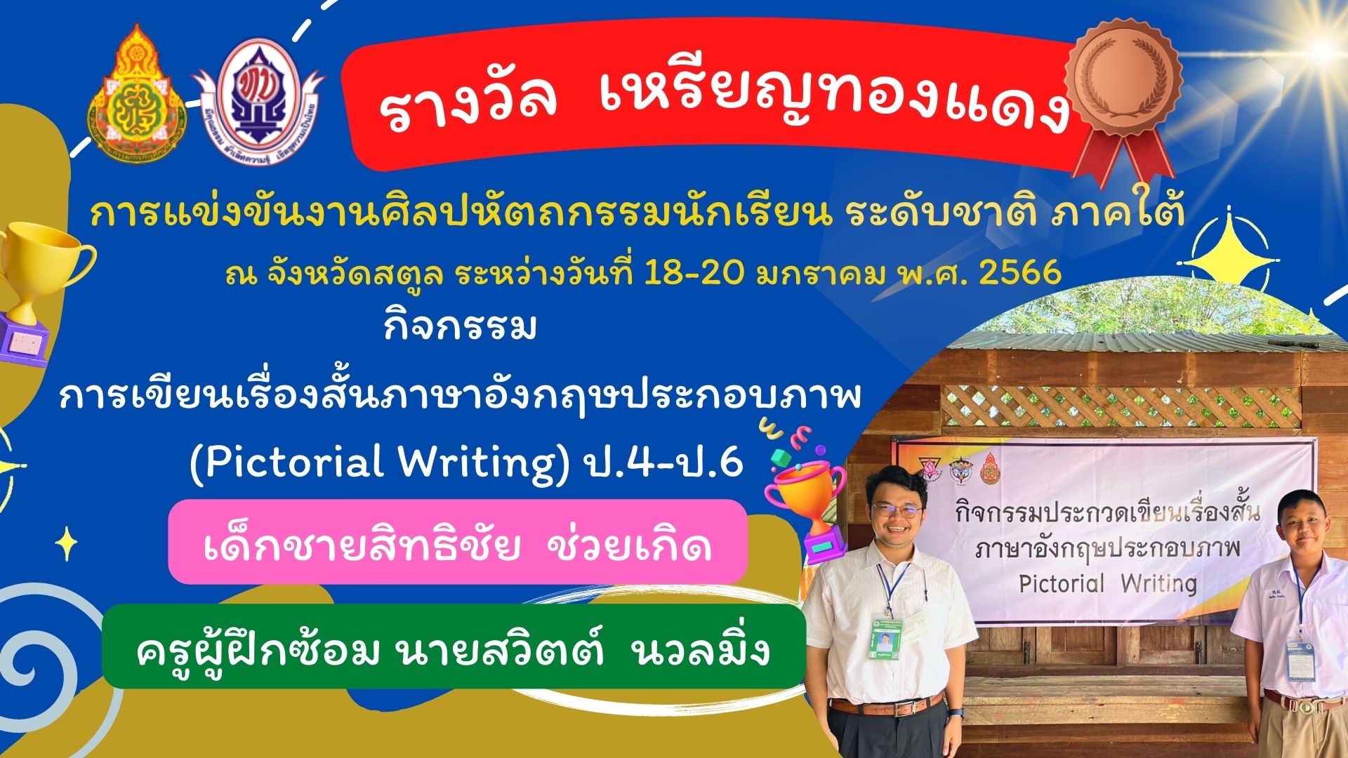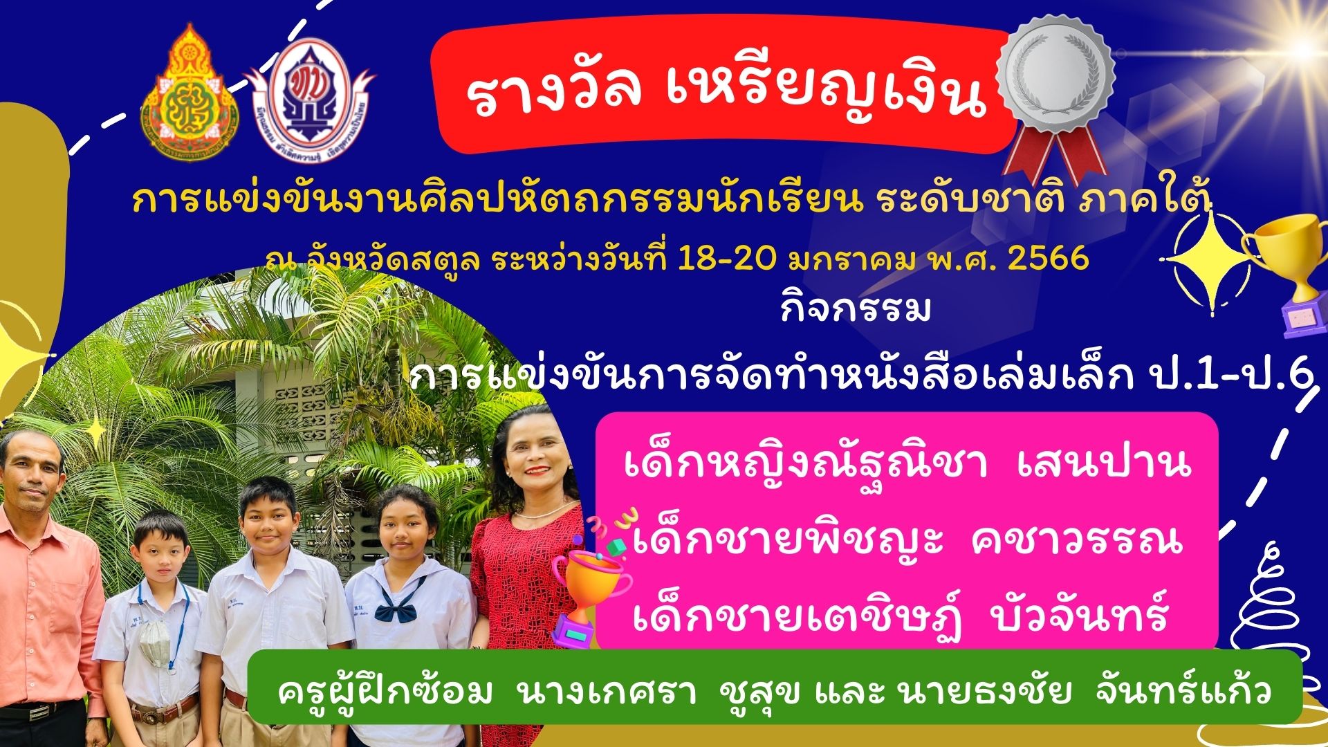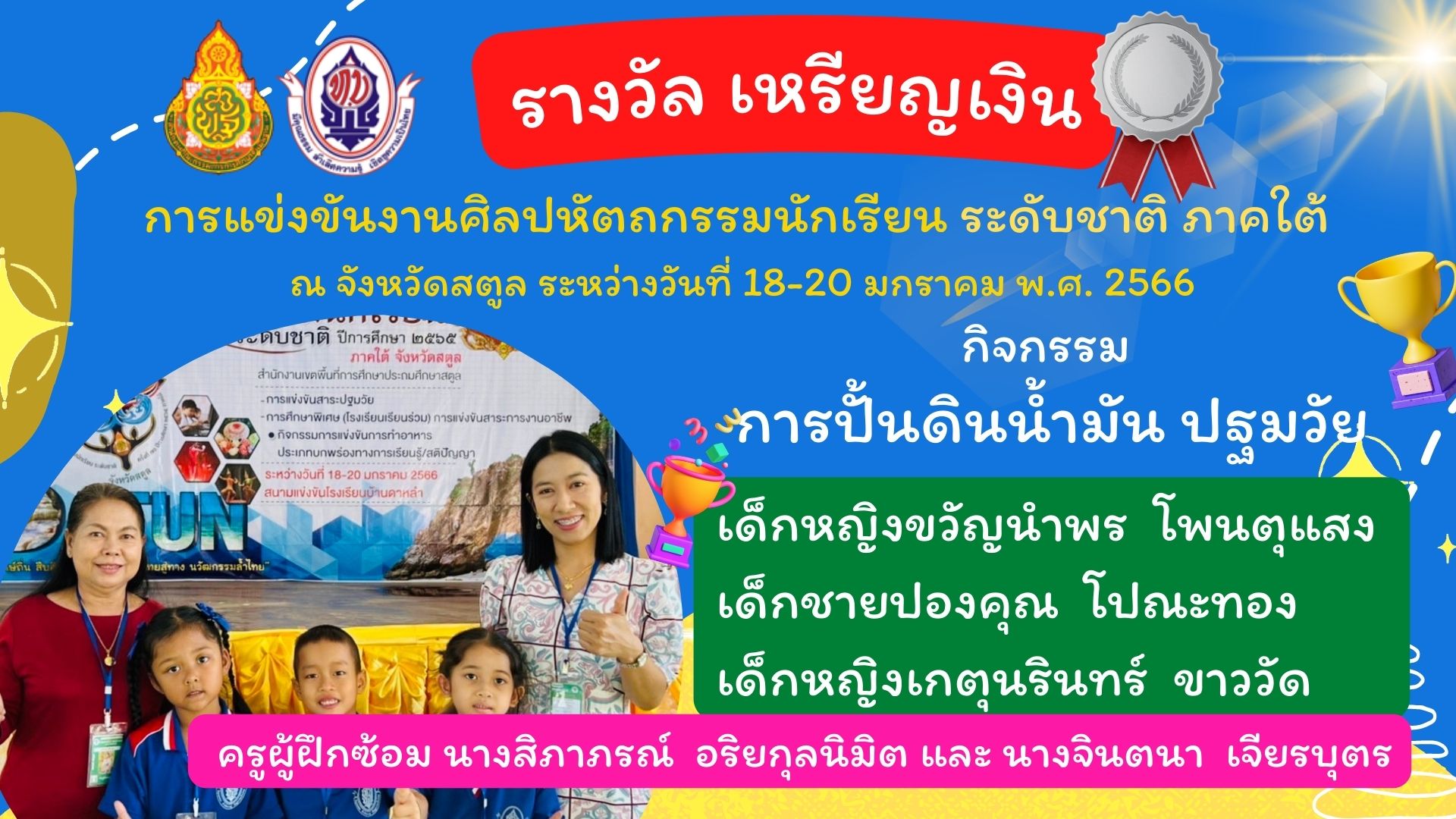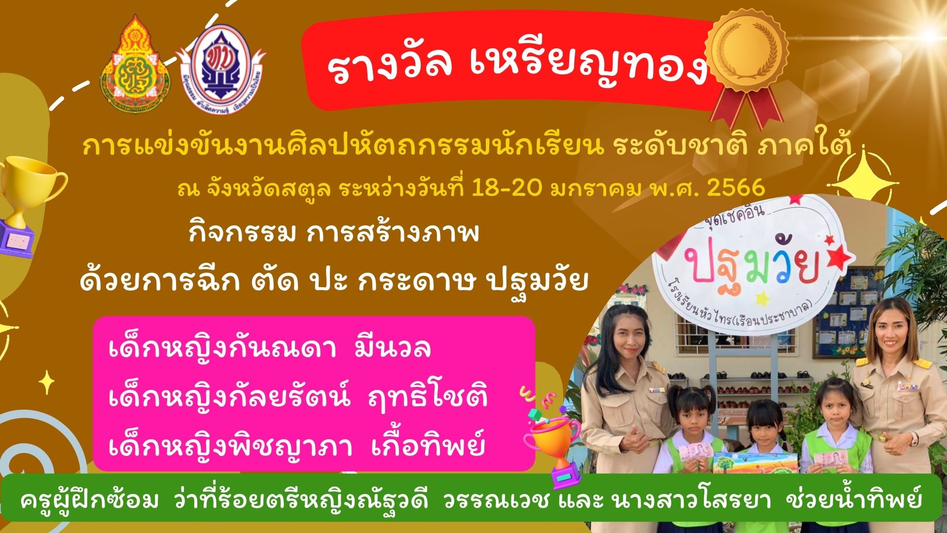 ชื่อผลงาน : รางวัลเหรียญทอง การสร้างภาพด้วยการฉีก ตัด ปะ กระดาษ ปฐมวัย การแข่งขันงานศิลปหัตถกรรมนักเรียน ระดับชาติ ภาคใต้ ครั้งที่ 70 ปีการศึกษา 2565 ณ จังหวัดสตูล ระหว่างวันที่ 18-20 มกราคม 2566