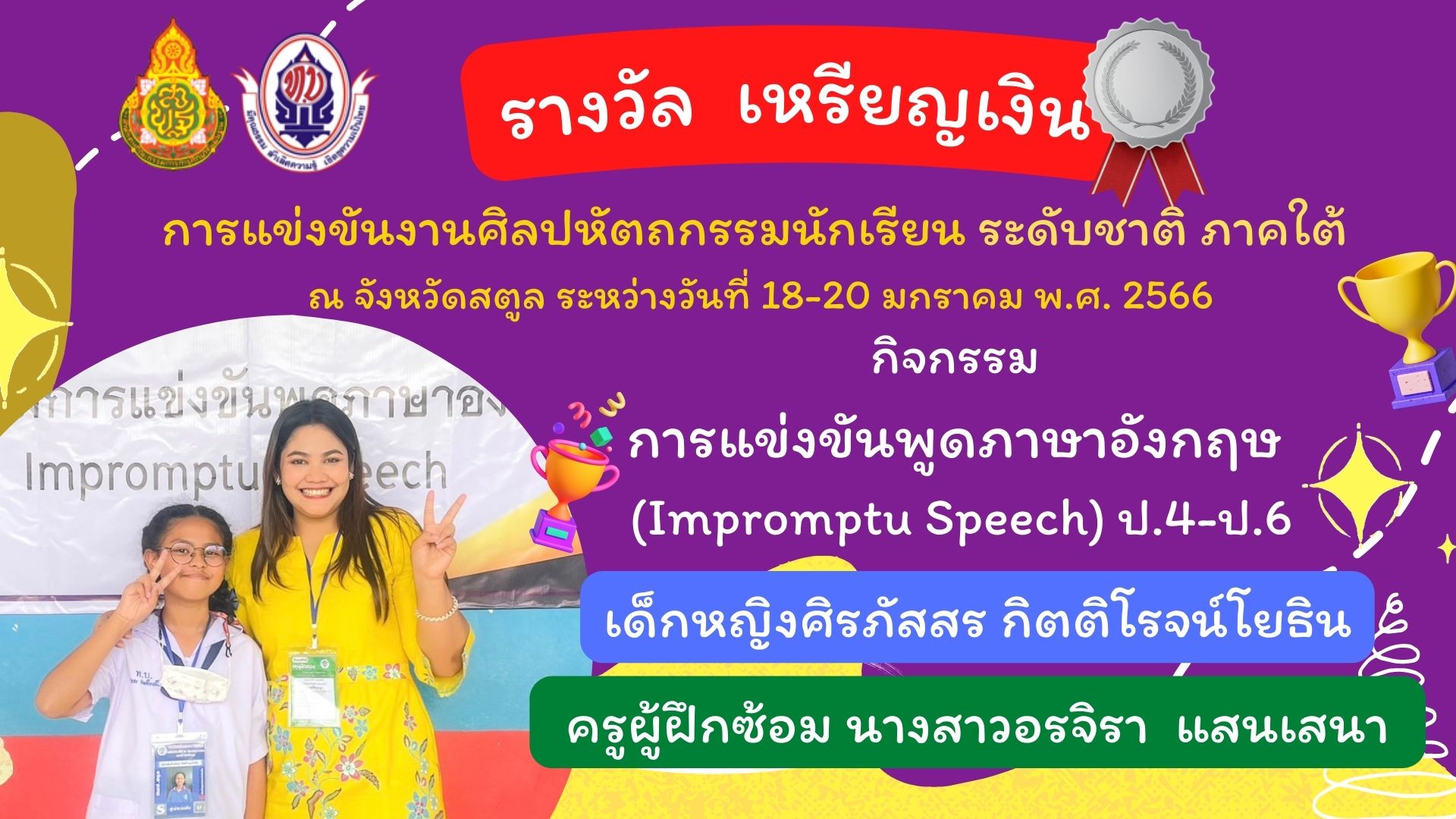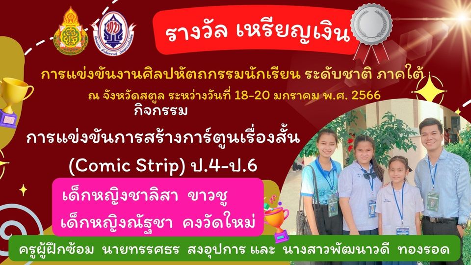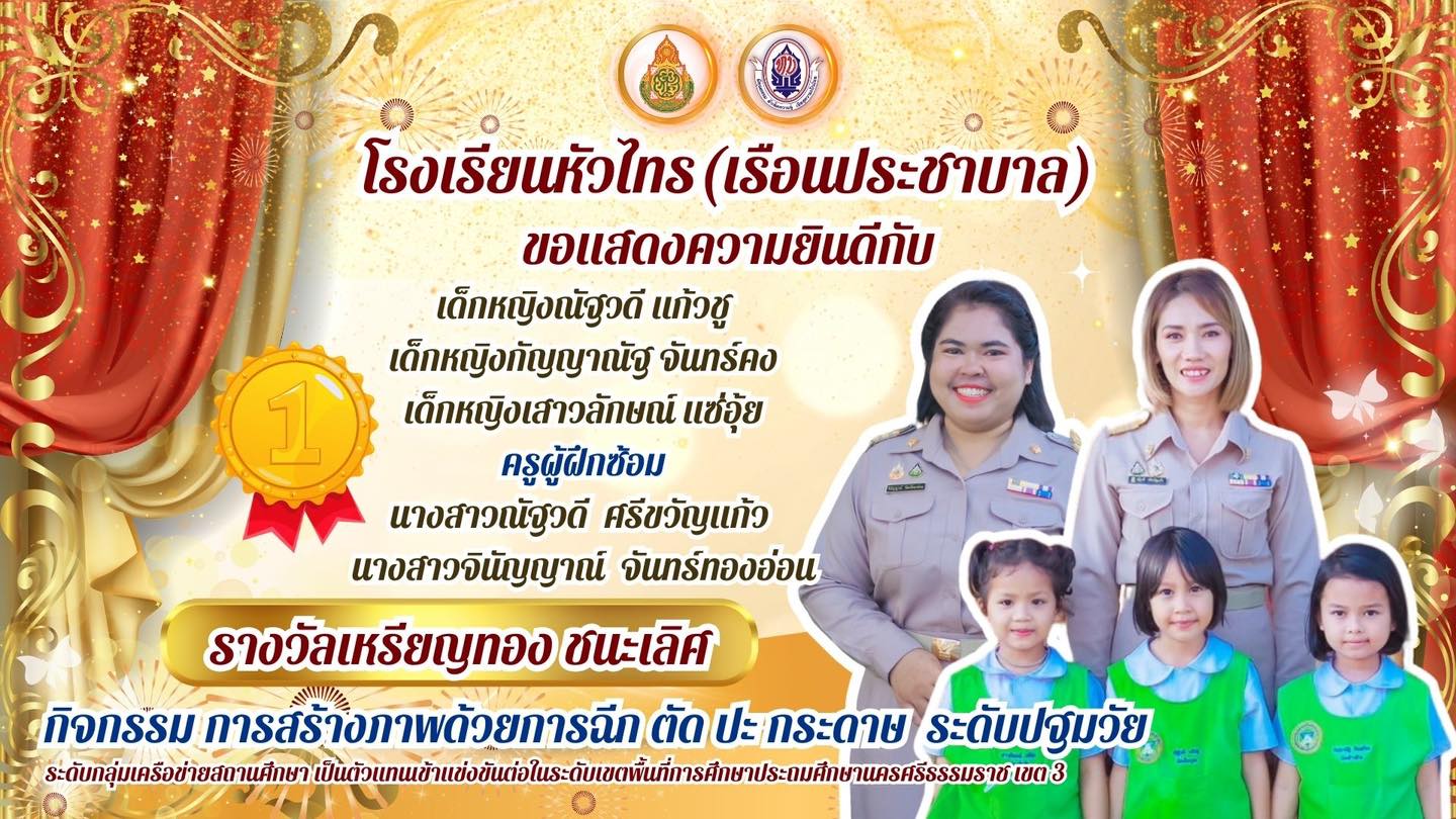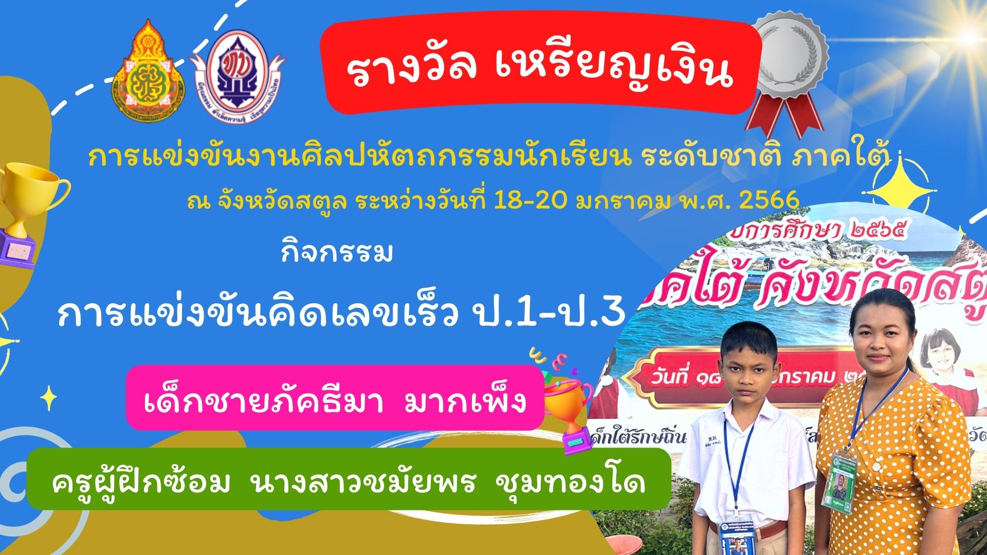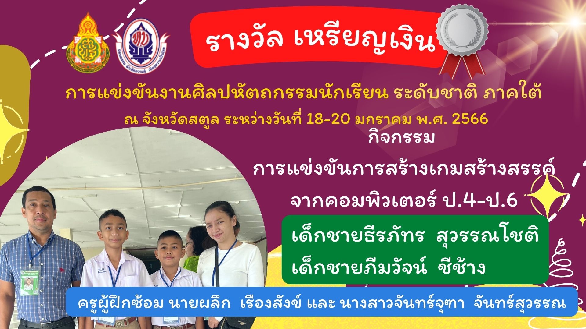 ชื่อผลงาน : รางวัลเหรียญทอง การสร้างภาพด้วยการฉีก ตัด ปะ กระดาษ ปฐมวัย การแข่งขันงานศิลปหัตถกรรมนักเรียน ระดับชาติ ภาคใต้ ครั้งที่ 70 ปีการศึกษา 2565 ณ จังหวัดสตูล ระหว่างวันที่ 18-20 มกราคม 2566