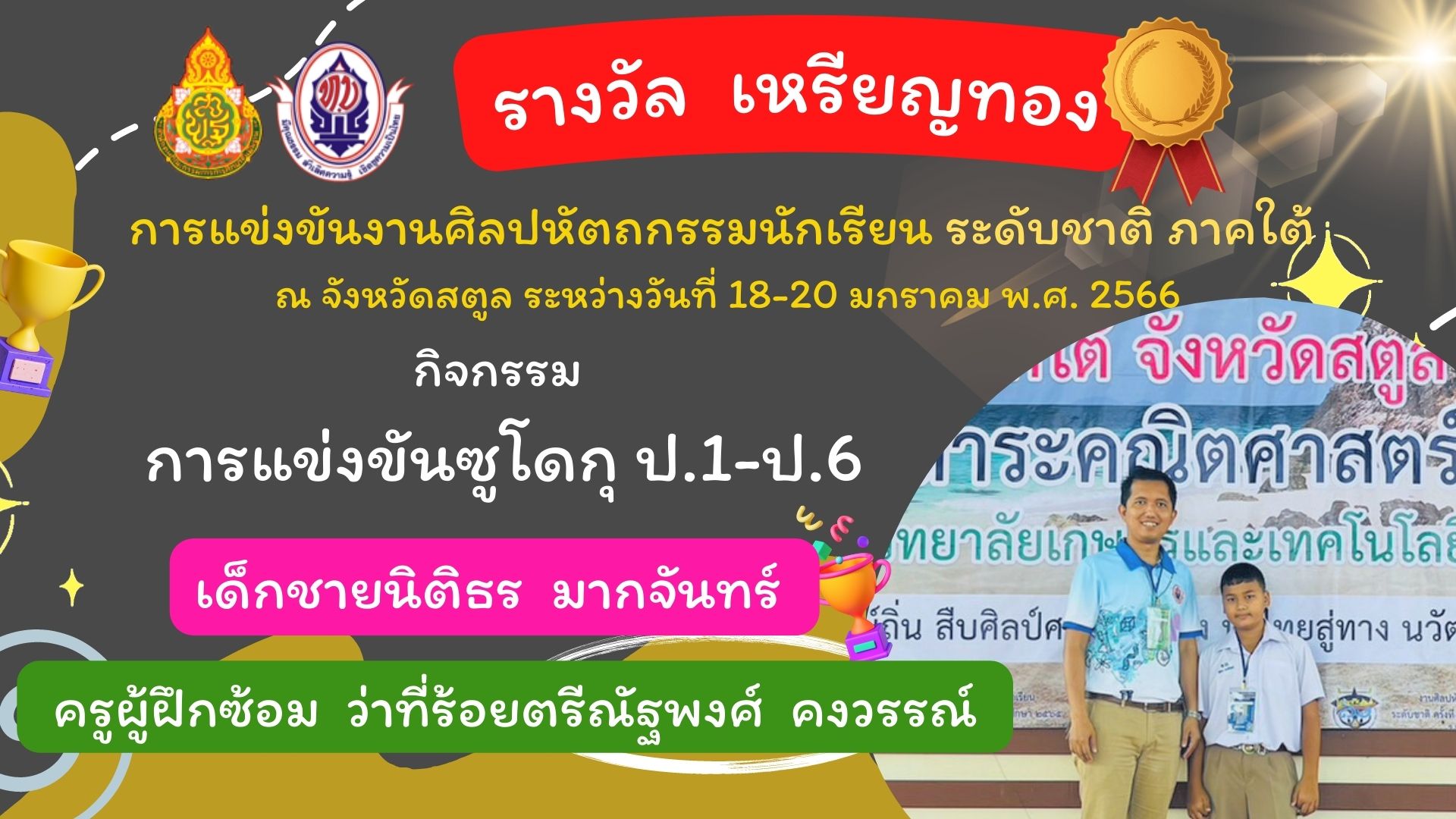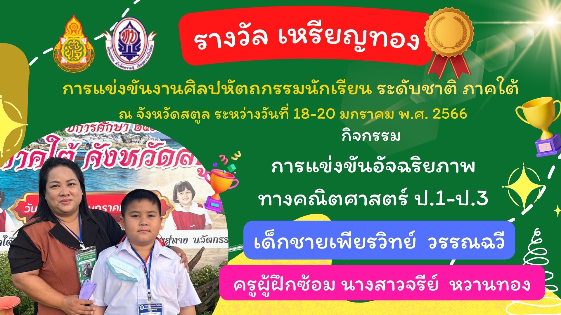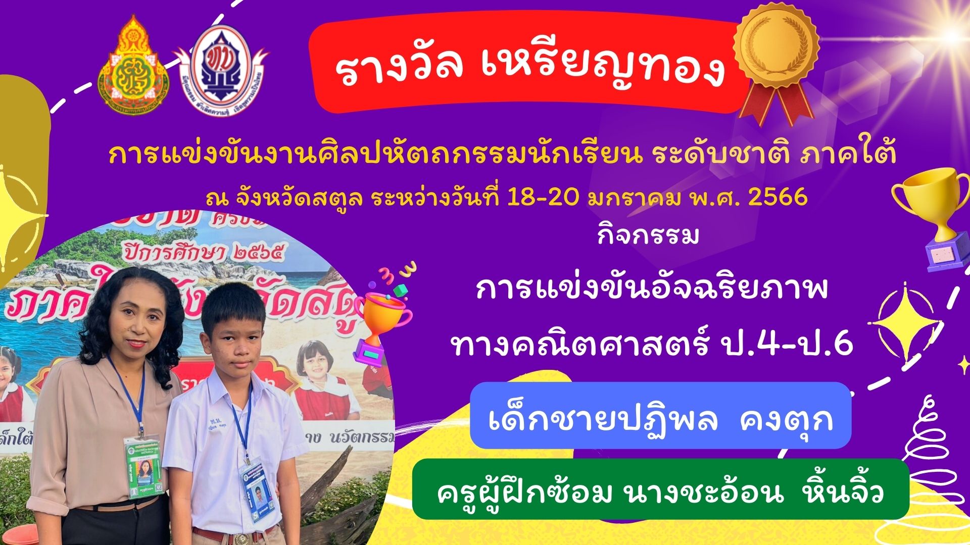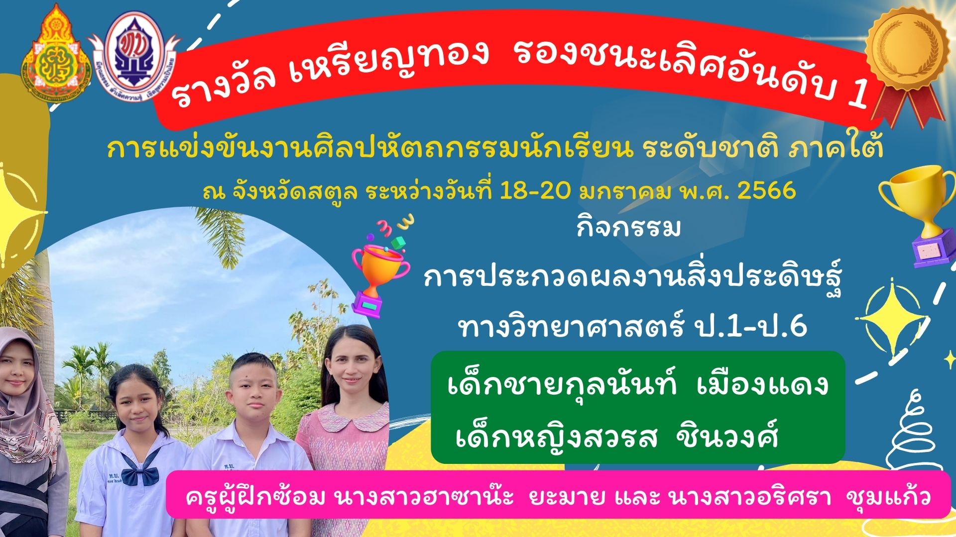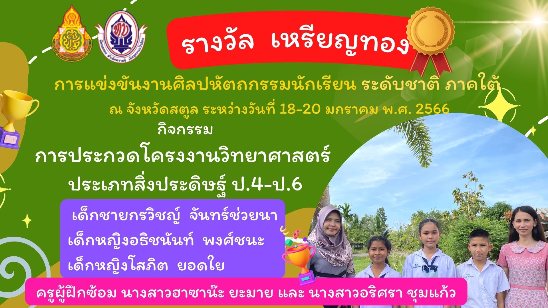 ชื่อผลงาน : รางวัลเหรียญทอง การประกวดโครงงานวิทยาศาสตร์ ประเภทสิ่งประดิษฐ์ ป.4-ป.6 การแข่งขันงานศิลปหัตถกรรมนักเรียน ระดับชาติ ภาคใต้ ครั้งที่ 70 ปีการศึกษา 2565 ณ จังหวัดสตูล ระหว่างวันที่ 18-20 มกราคม 2566