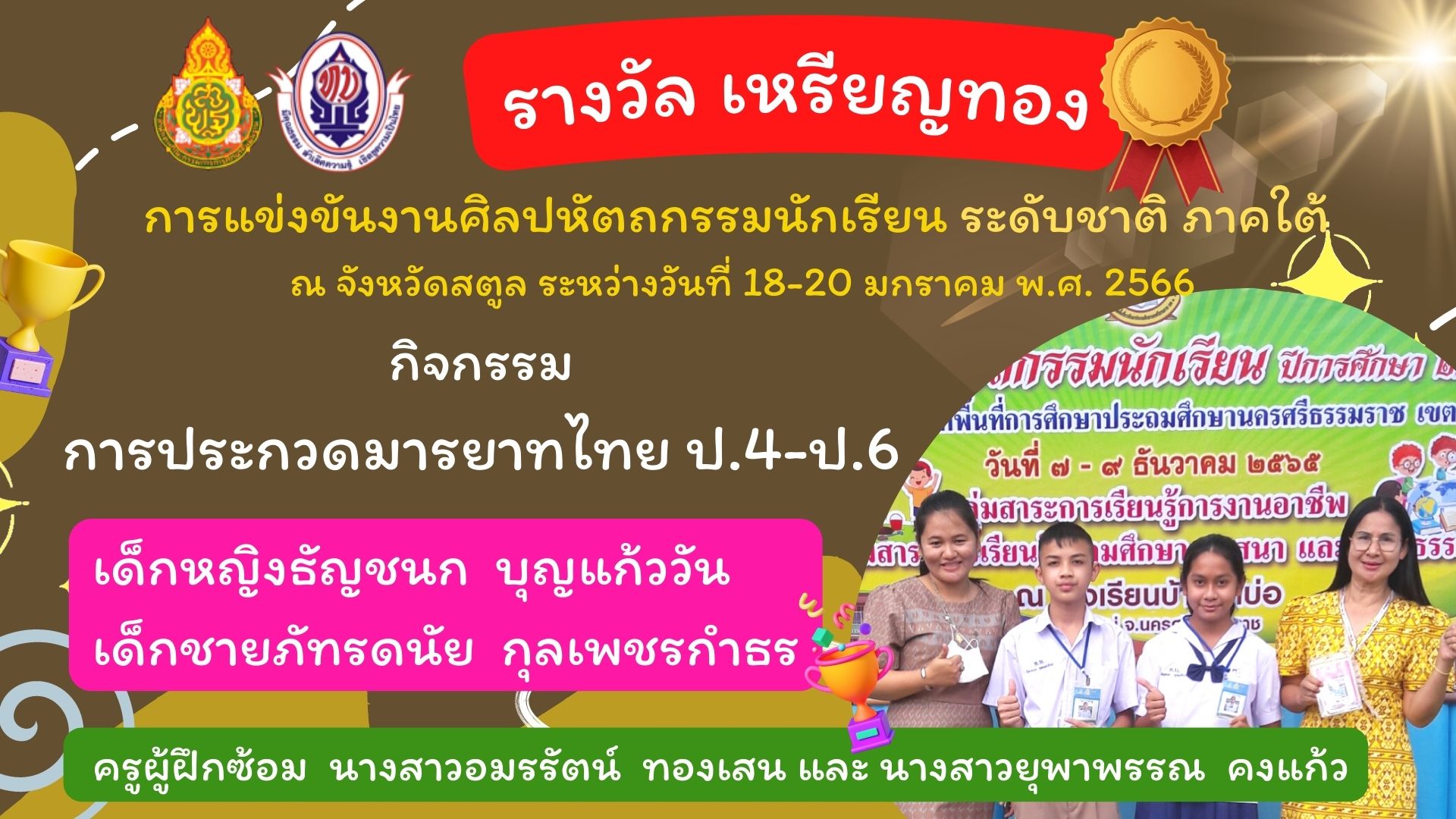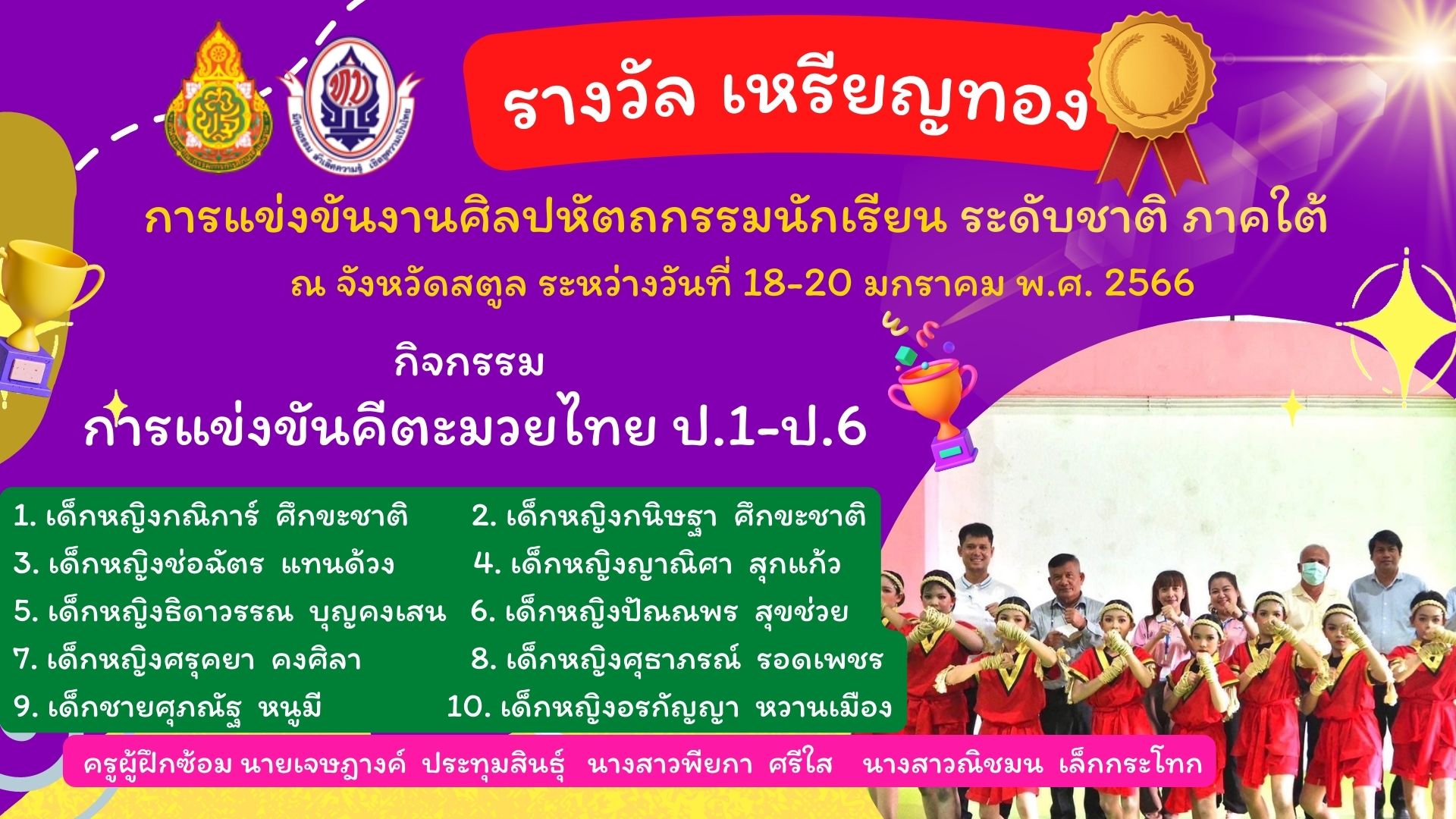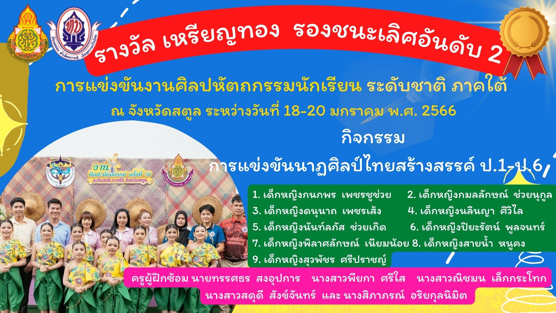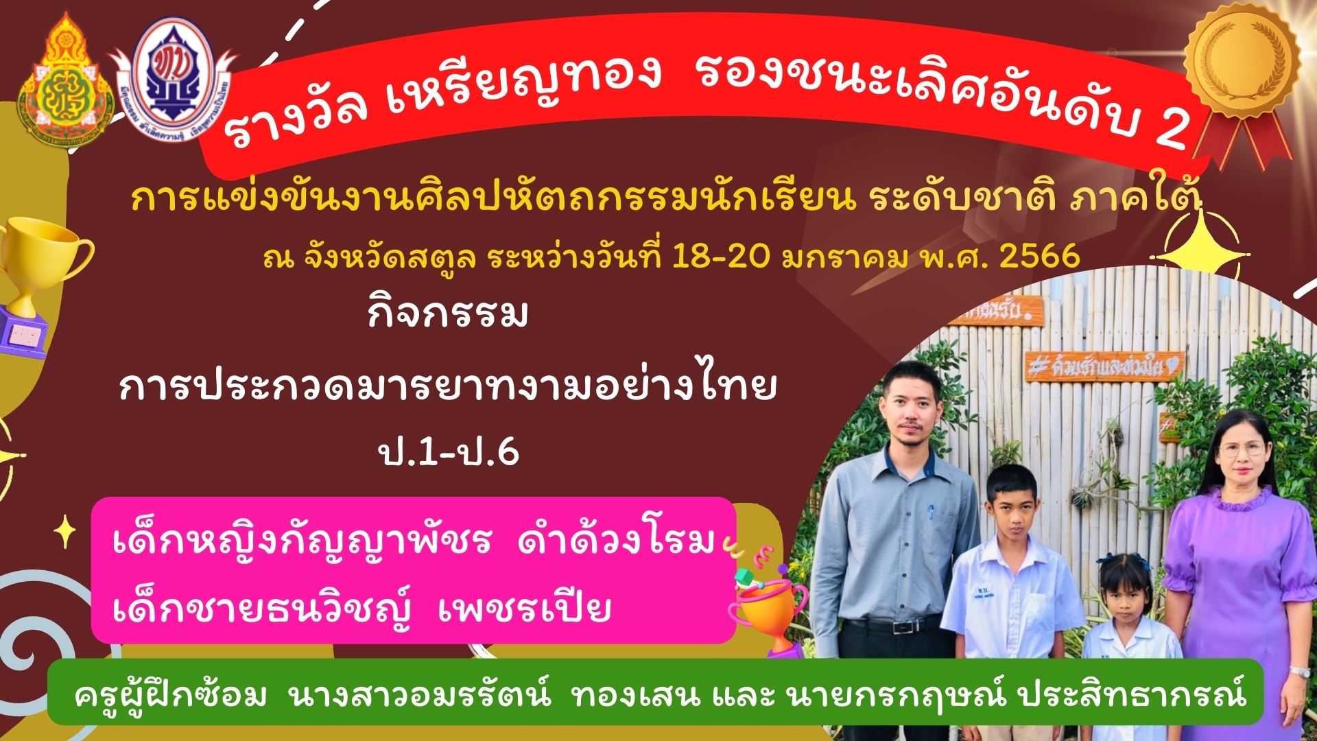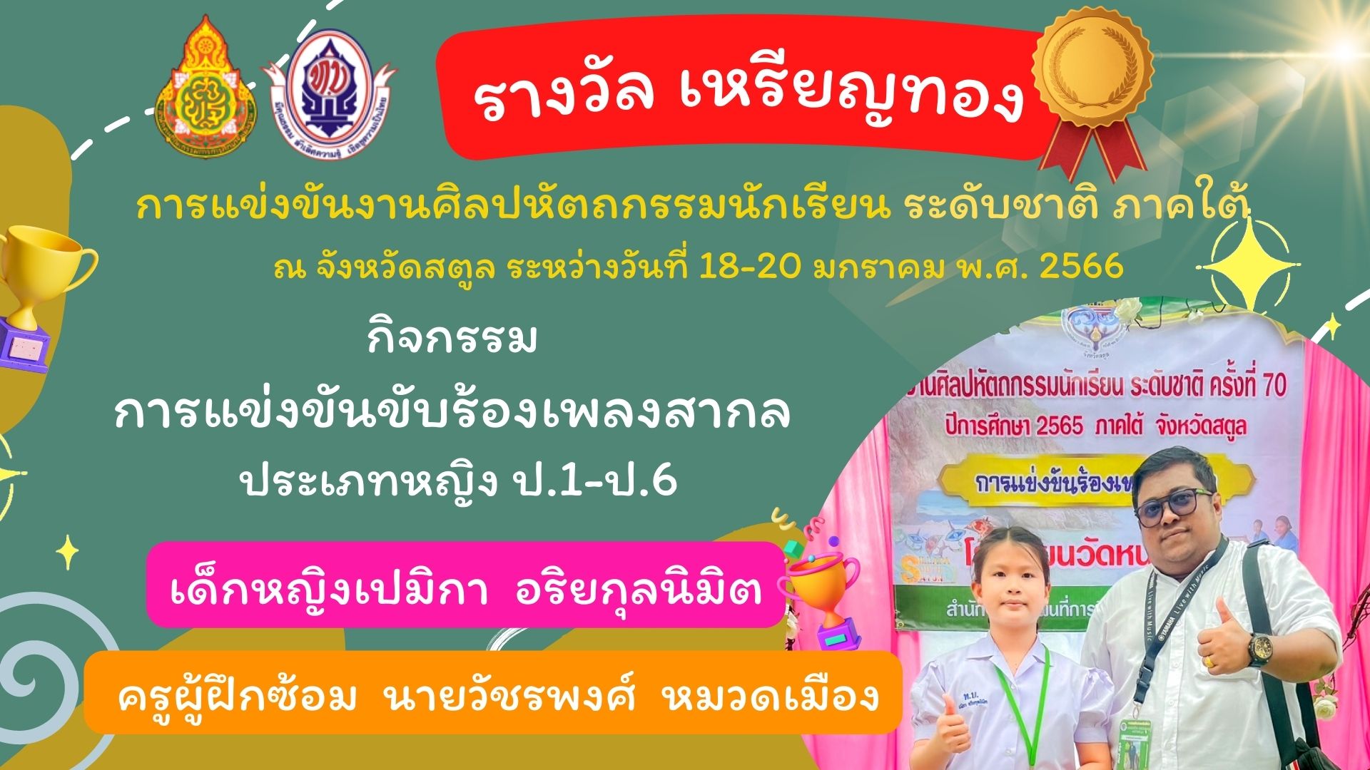 ชื่อผลงาน : รางวัลเหรียญทอง การประกวดโครงงานวิทยาศาสตร์ ประเภทสิ่งประดิษฐ์ ป.4-ป.6 การแข่งขันงานศิลปหัตถกรรมนักเรียน ระดับชาติ ภาคใต้ ครั้งที่ 70 ปีการศึกษา 2565 ณ จังหวัดสตูล ระหว่างวันที่ 18-20 มกราคม 2566