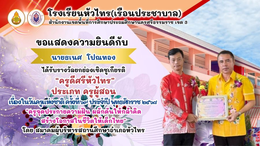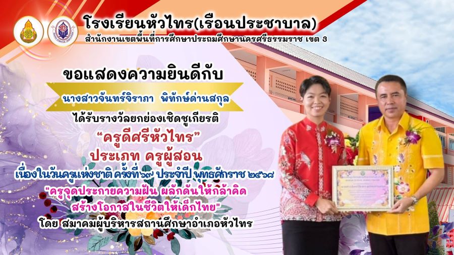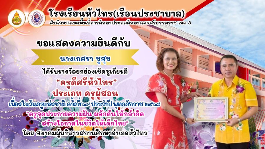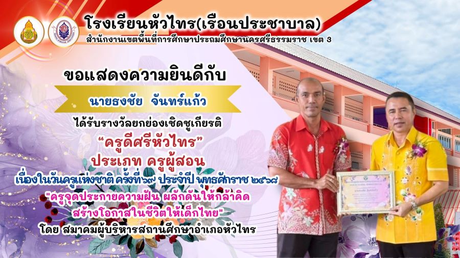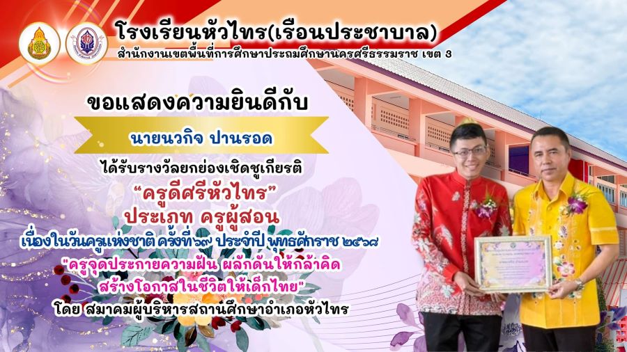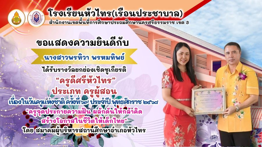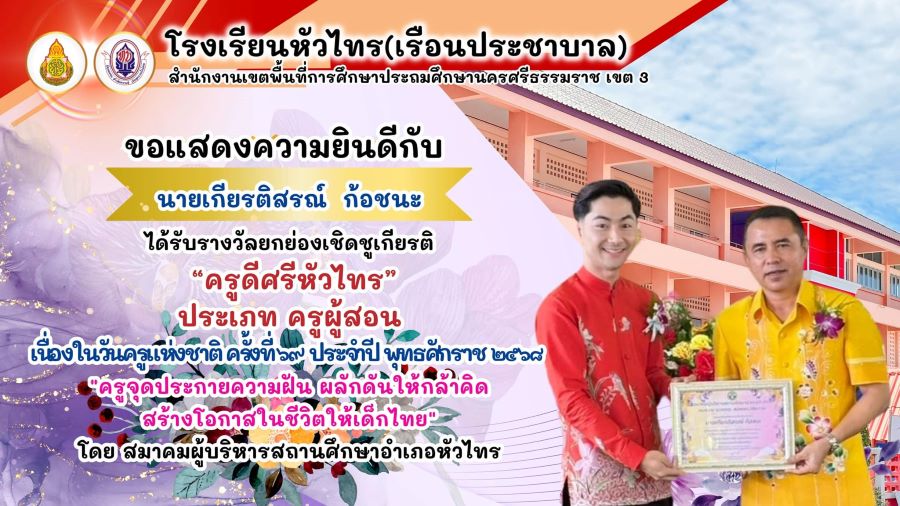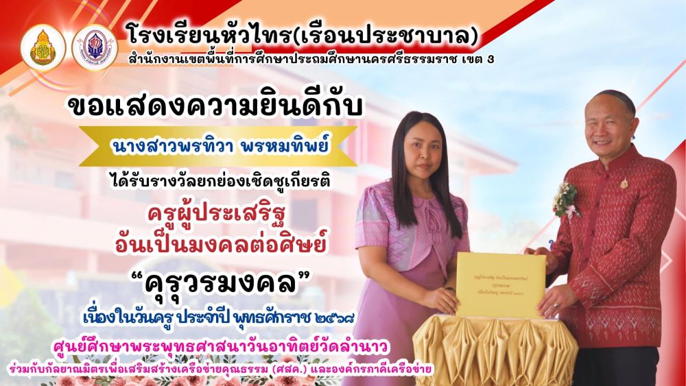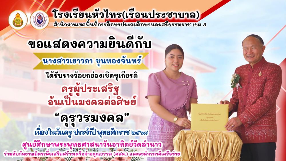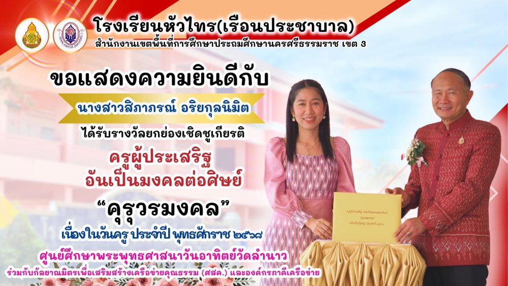 รางวัลยกย่องเชิดชูเกียรติ “คุรุวรมงคล“ เนื่องในโอกาสวันครู ประจำปี 2568 จากพลเอกเกรียงศักดิ์ ศรีรักษ์ รองประธานวุฒิสภา มอบโดยนายรัชพร วรรณคำ รองศึกษาธิการภาค สำนักงานศึกษาธิการภาค 5 รักษาการในตำแหน่งศึกษาธิการภาคสำนักงานศึกษาธิการภาค 5 |