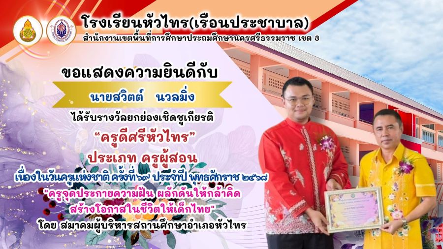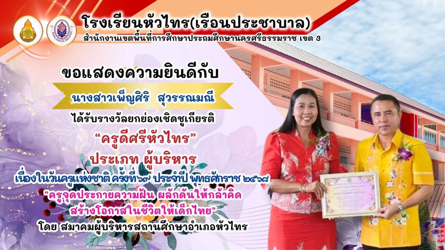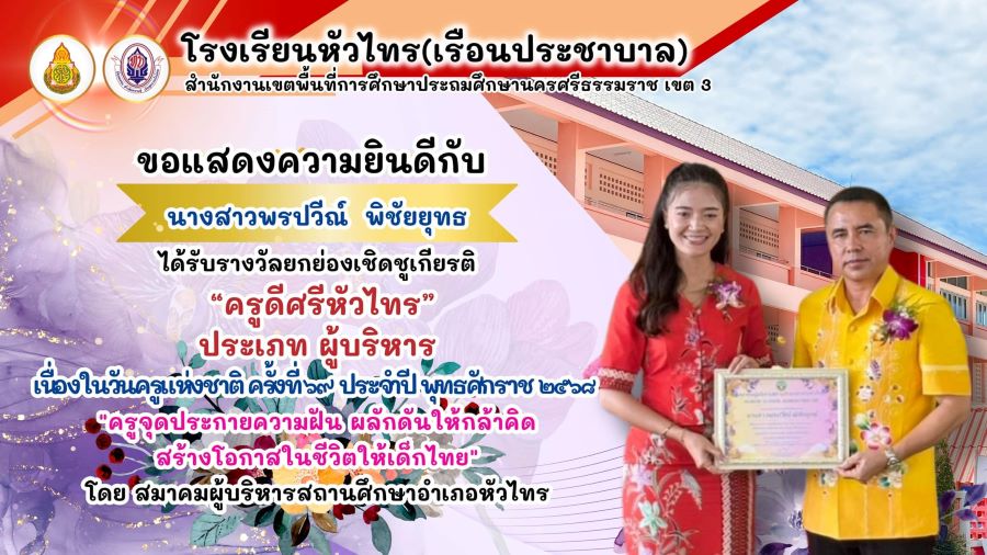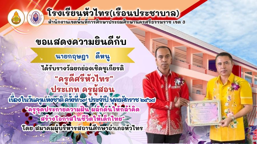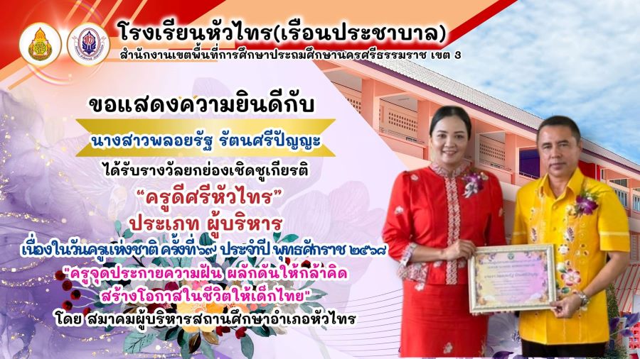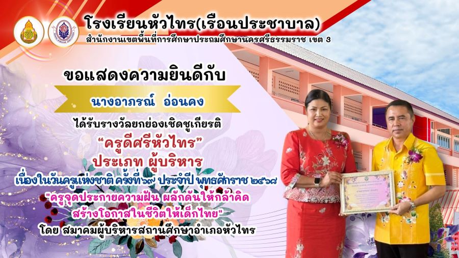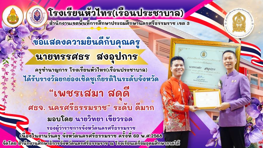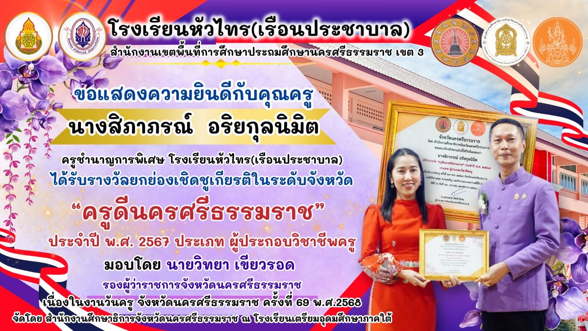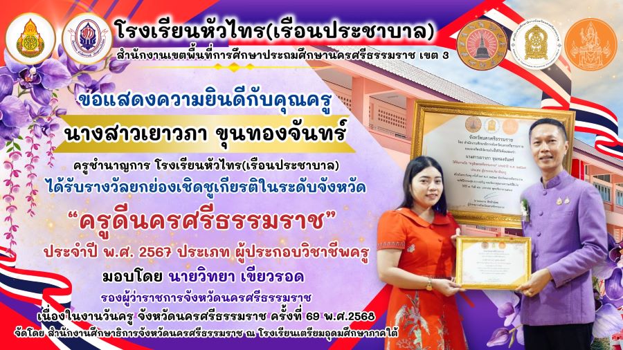ขอแสดงความยินดีกับคุณครู เยาวภา ขุนทองจันทร์ ได้รับรางวัลยกย่องเชิดชูเกียรติในระดับจังหวัด “ครูดีนครศรีธรรมราช” ประจำปี พ.ศ. 2567 ประเภท ผู้ประกอบวิชาชีพครู ได้รับเกียรติบัตรเชิดชูเกียรติในงานวันครู ครั้งที่ 69 พ.ศ.2568 |